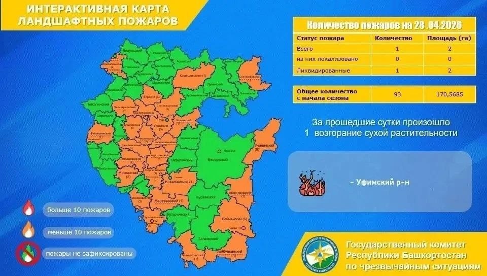 Также зафиксирован 1 случай горения сухой растительности. Инцидент произошёл в Уфимском районе. Сгорело 2 га травы.