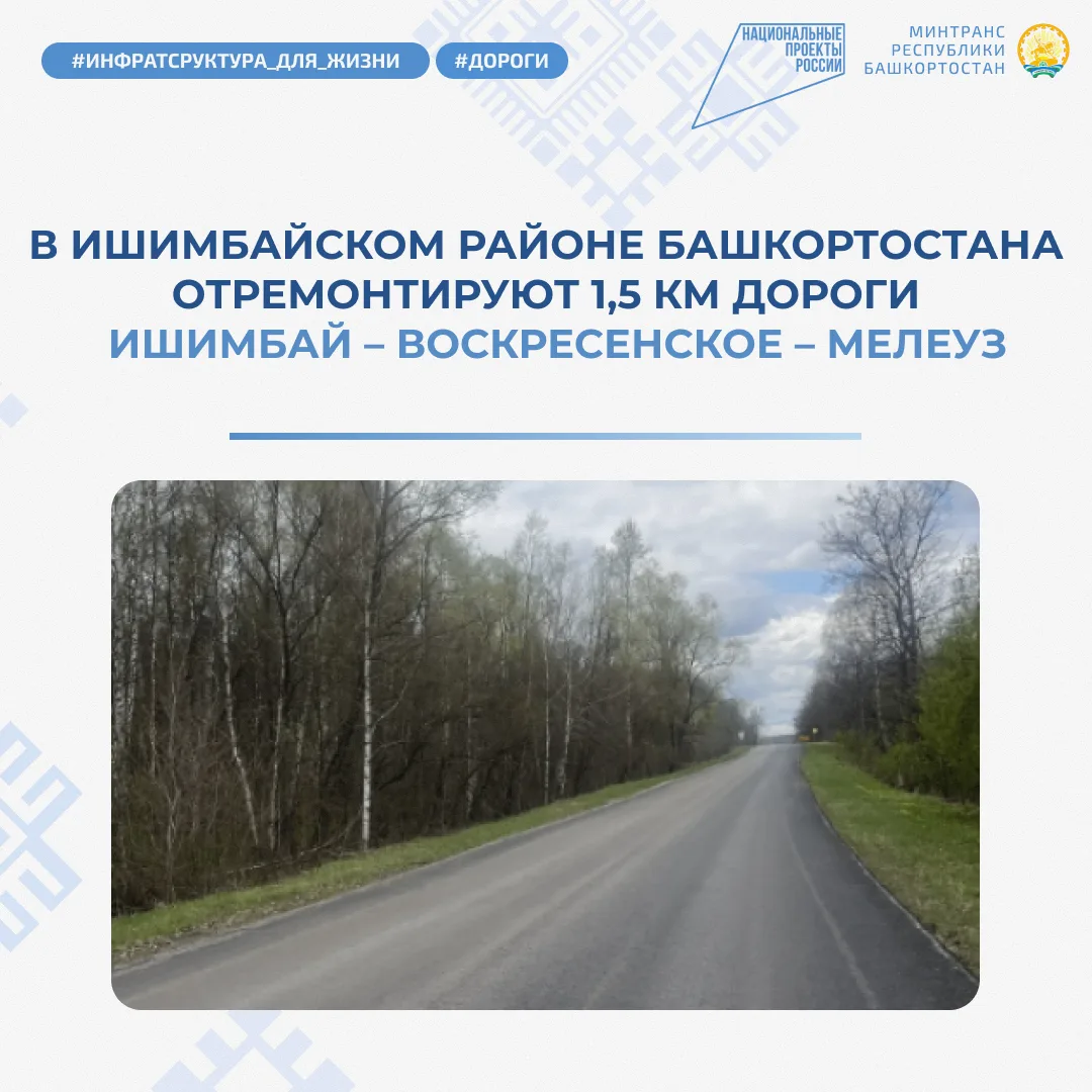 Все работы на данном участке завершат до конца 2026 года. Всего в этом году в рамках нацпроекта «Инфраструктура для жизни» приведут в нормативное состояние 6,5 км дороги Ишимбай – Воскресенское – Мелеуз в Мелеузовском и Ишимбайском районах.
