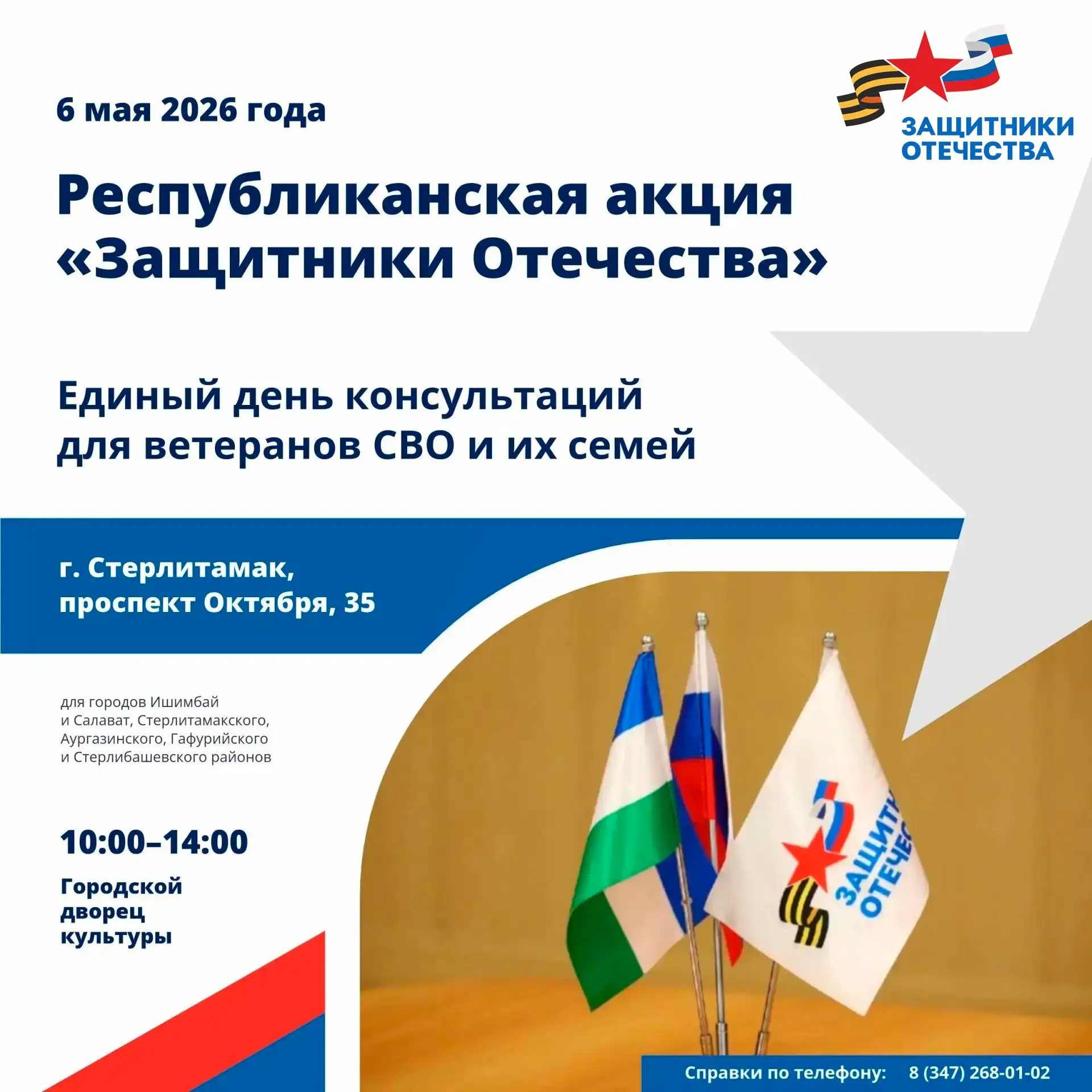 6 мая в Стерлитамаке состоится единый день консультаций для ветеранов СВО и их семей. Мероприятие организует филиал фонда «Защитники Отечества» в Башкортостане.