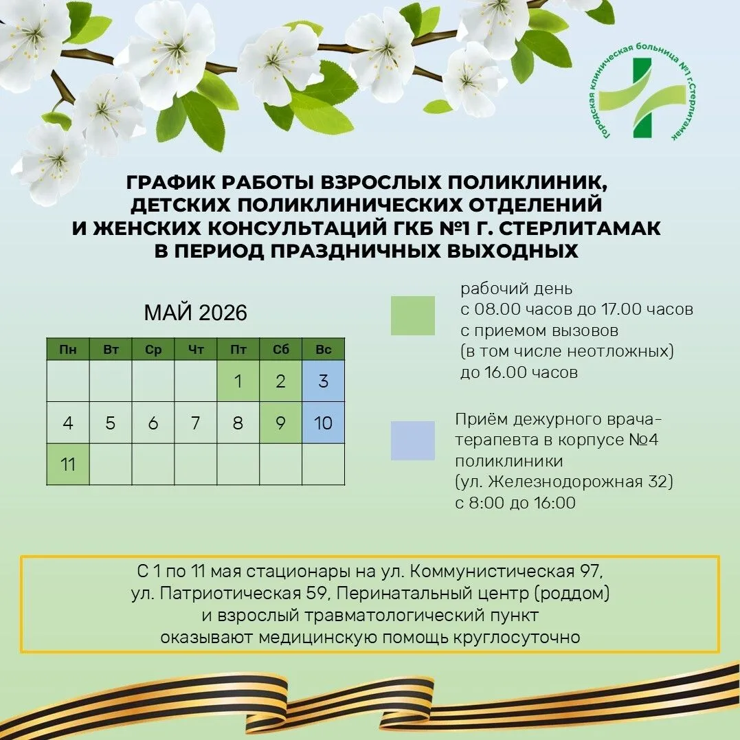 График приёма пациентов в поликлиниках, детских поликлинических отделениях и женских консультациях Городской клинической больницы №1 в период с 1 по 11 мая.