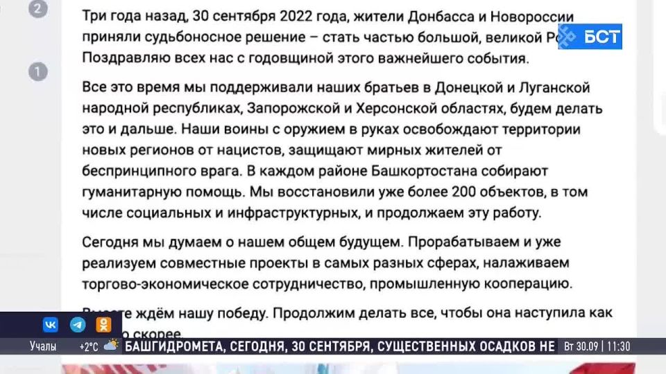 Радий Хабиров поздравил жителей Донбасса, Луганщины, Запорожья и Херсонщины с воссоединением с Россией. Глава Башкортостана отметил, что наша республика всегда помогала новым территориям и будет продолжать выполнять эту миссию дальше.Подписывайся...