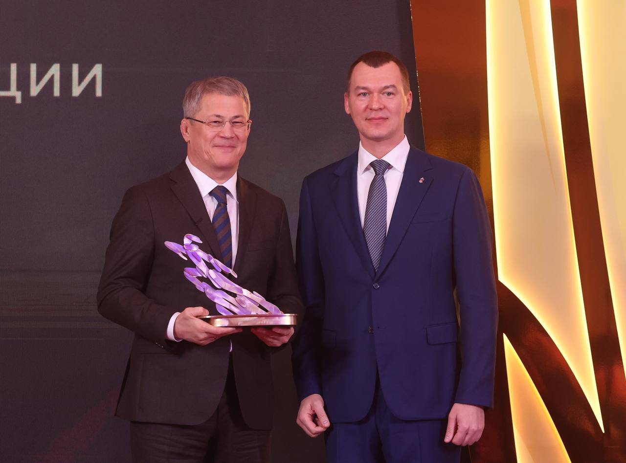 Также вручил сегодня статуэтку победителю в номинации «Регион России: лучший субъект Российской Федерации». Им стала Республика Башкортостан.