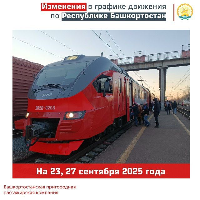 В связи с ремонтными работами на перегонах Шакша—Черниковка и Тавтиманово—Иглино изменяется расписание пригородных поездов:23 сентября 2025 г. № 6412 Дема — Улу-Теляк отправится на 12 мин. позже: Дема 13:37 Улу-Теляк 15:30.27 сентября 2025 г. №...